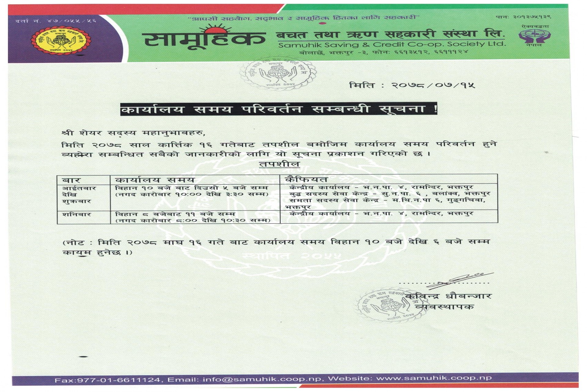 कार्यालय समय परिवर्तन सम्बन्धी सूचना