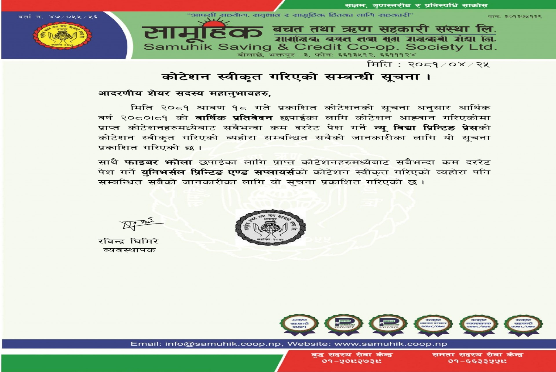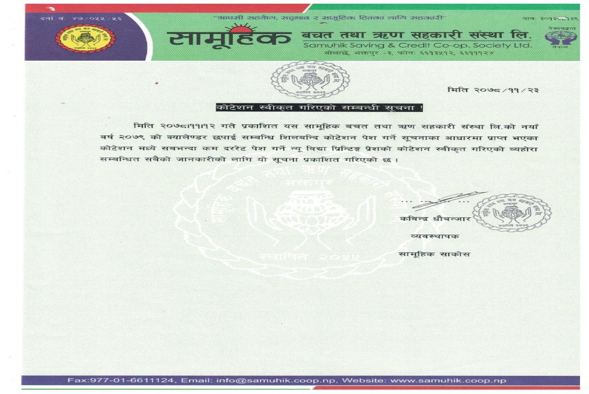 कोटेशन स्वीकृत गरिएको सम्बन्धी सूचना