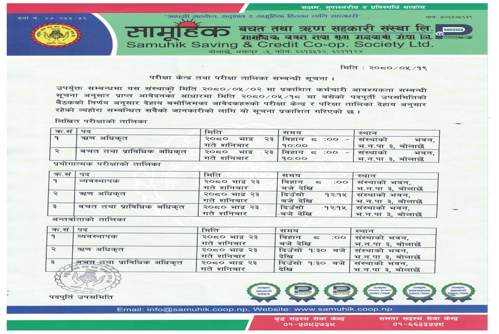 परिक्षा केन्द्र तथा तालिका सम्बन्धी सूचना