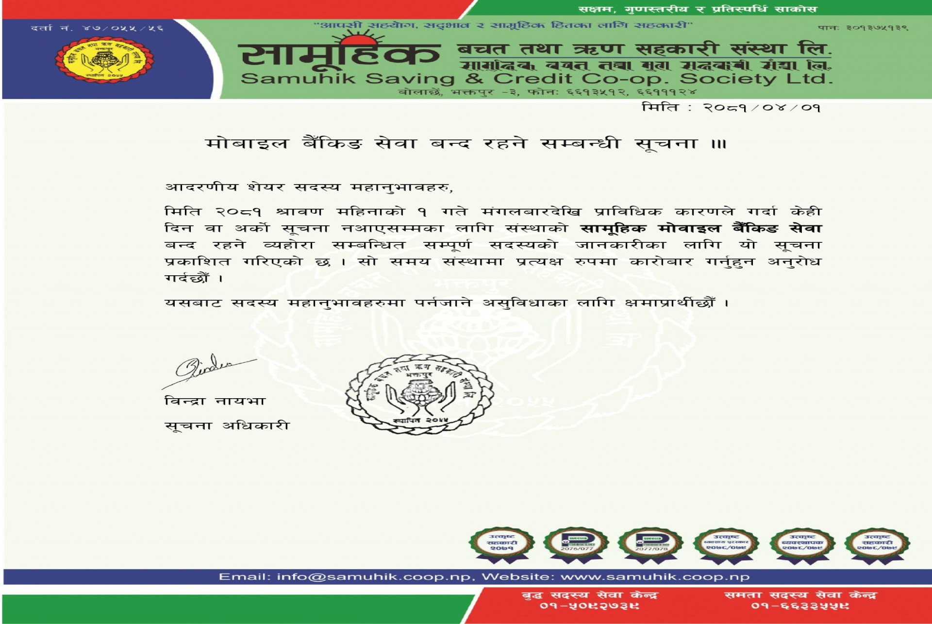 मोवाइल बैकिङ सेवा बन्द रहने सम्बन्धि सूचना