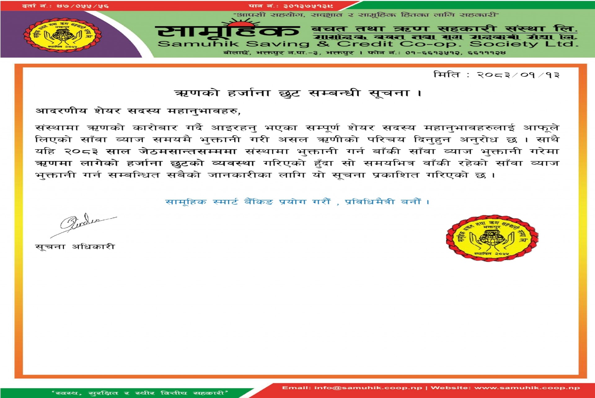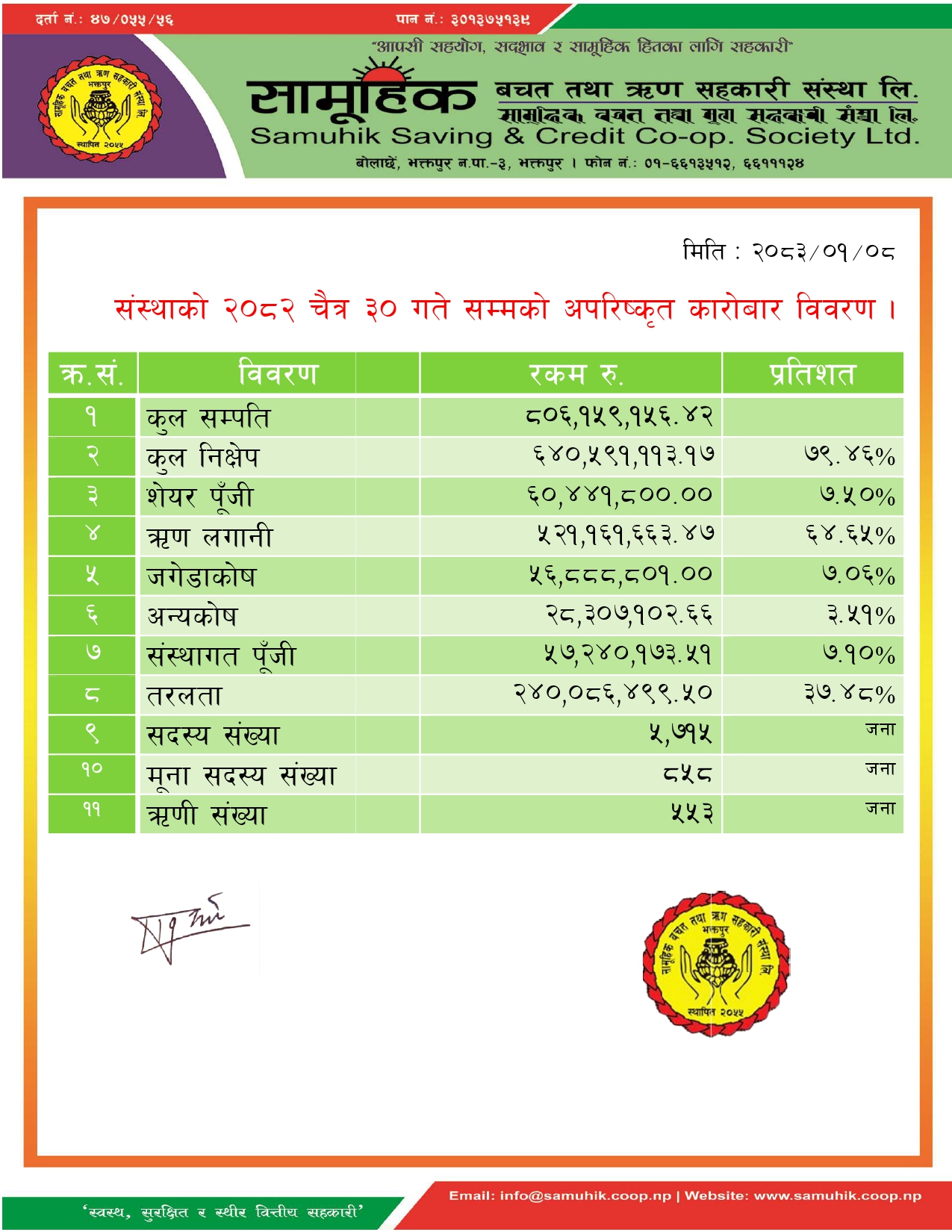 यहि मिति २०८१।११।१० गते शनिबार होटेल सिटिगाउँ, भातेढिकुरी ,भक्तपुरमा आ.व.२०८१।०८२ को अर्धबार्षिक समिक्षा कार्यक्रम संस्थाका संचालक समिति, लेखा सुपरीवेक्षण समिति , सल्लाकारहरु, विभिन्न उप समितिका...